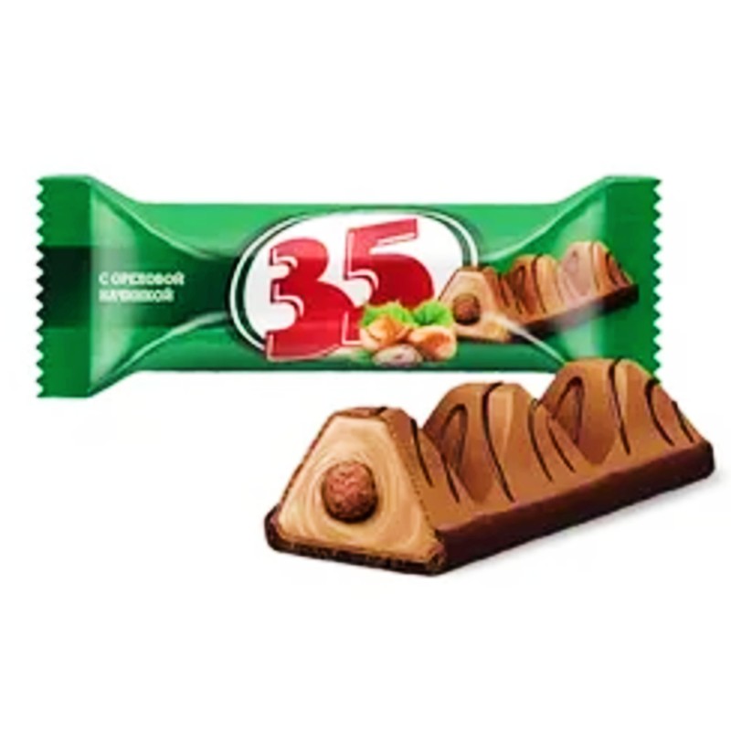 Батончик «35» — вкусный, хрустящий на основе полых вафель, частично глазированный, с нежной начинкой со вкусом шоколада и рисовым шариком внутри.