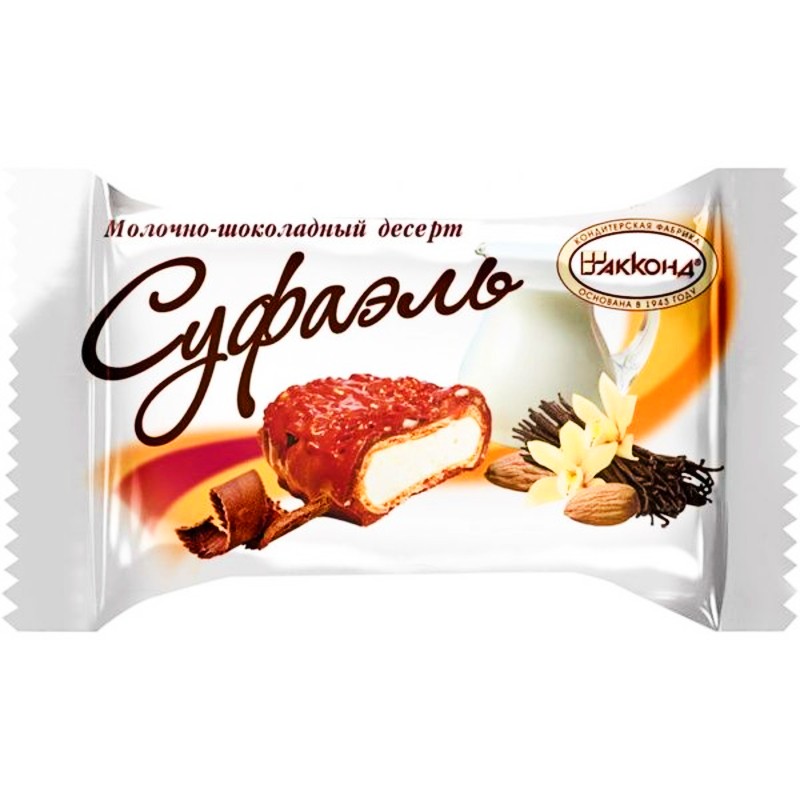 Десерт на основе сливочного суфле в вафельном корпусе в молочной шоколадной глазури в обсыпке крупкой миндаля.