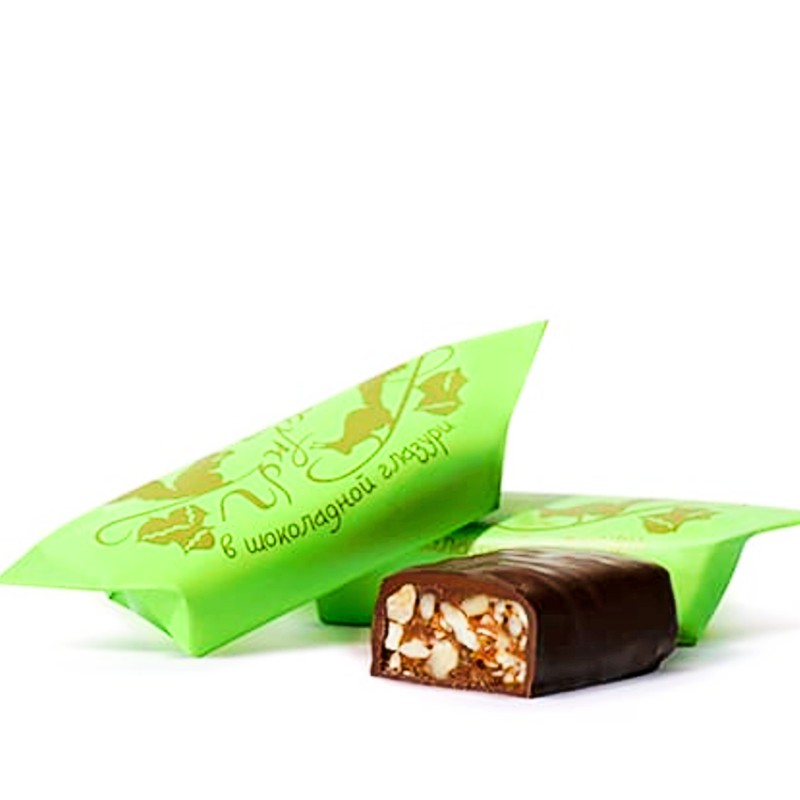 Традиционный «Грильяж в шоколаде» от фабрики «Рот Фронт» – тягучая полупрозрачная карамель, в которой увязли осколки дробленых лесных орехов.