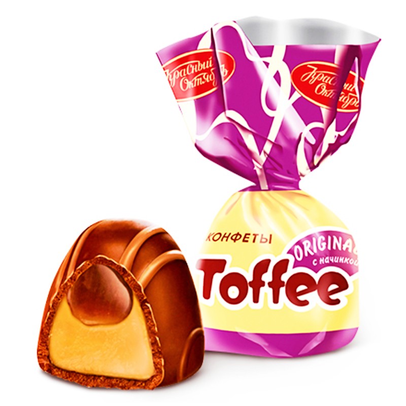 Мягкая, тягучая начинка конфеты «Тоффи Оригинал» состоит из двух слоев: сливочного и карамельного, напоминающего вареную сгущенку.
