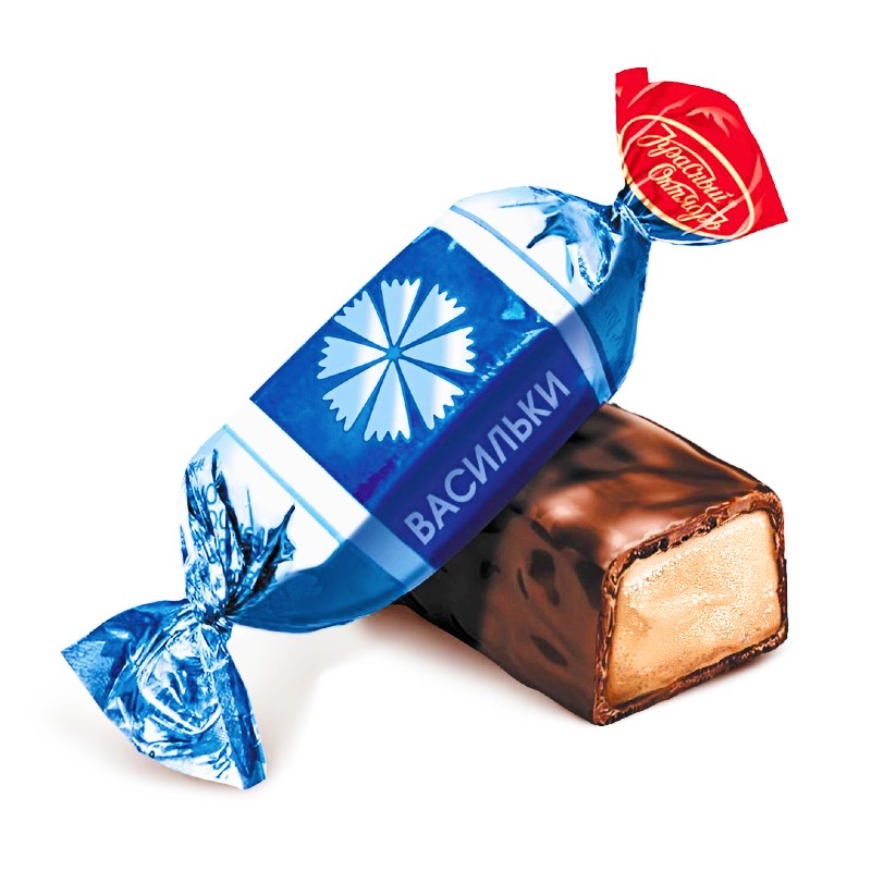 Конфеты «Васильки» в шоколадной глазури: воздушная тающая помадка со вкусом крем-брюле, обогащенная тертыми орешками кешью и коньяком.