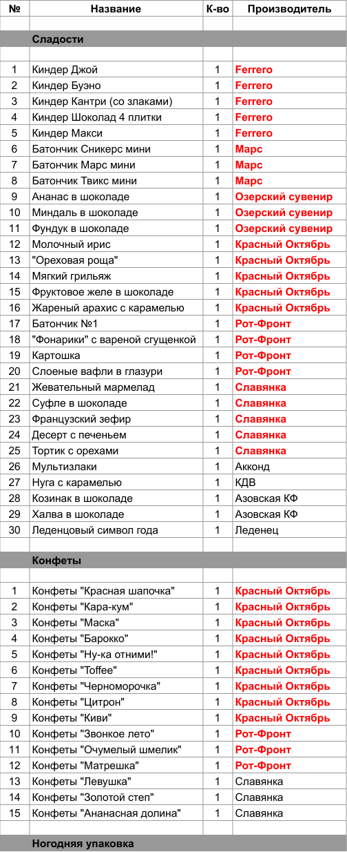 Батончик №1 (1 шт), "Фонарики" с вареной сгущенкой (1 шт), Картошка (1 шт), Слоеные вафли в глазури (1 шт), Конфеты "Звонкое лето" (1 шт), Конфеты "Очумелый шмелик" (1 шт), Конфеты "Матрешка" (1 шт)