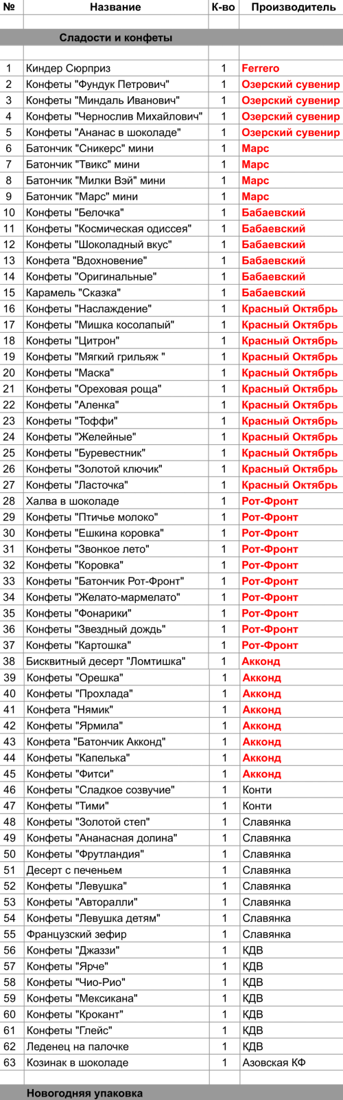 Халва в шоколаде (1 шт), Конфеты "Птичье молоко" (1 шт), Конфеты "Ешкина коровка" (1 шт), Конфеты "Звонкое лето" (1 шт), Конфеты "Коровка" (1 шт), Конфеты "Батончик Рот-Фронт" (1 шт), Конфеты "Желато-мармелато" (1 шт), Конфеты "Фонарики" (1 шт), Конфеты "Звездный дождь" (1 шт), Конфеты "Картошка" (1 шт)
