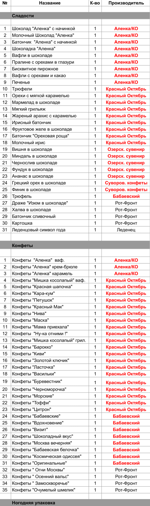 Шоколад "Аленка" с начинкой (1 шт), Молочный Шоколад "Аленка" (1 шт), Батончик  "Аленка" с начинкой (1 шт), Шоколадка "Аленка" (1 шт), Вафли в шоколаде (1 шт), Пралине с орехами в глазури (1 шт), Бисквитное пирожное (1 шт), Вафли с орехами и какао (1 шт), Печенье (1 шт), Конфеты  "Аленка" ваф. (1 шт), Конфеты "Аленка" крем-брюле (1 шт), Конфеты "Аленка" карамель (1 шт)